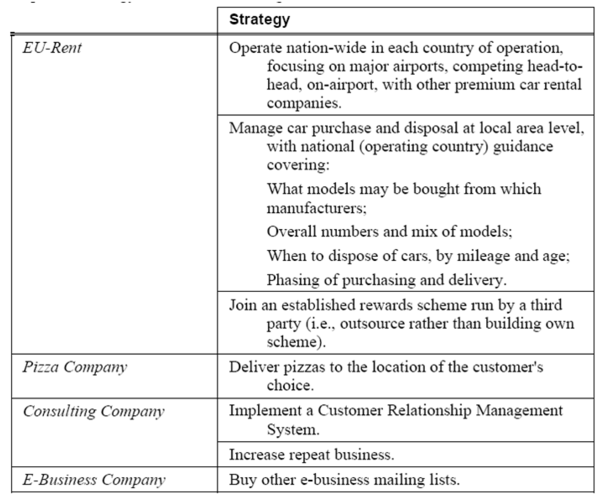 - e.g. the Business Rule "Pizzas may not be delivered beyond a radius of 30 miles" governs the Strategy "Deliver pizzas to the location of the customer's choice."