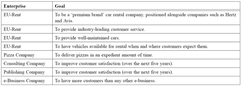 - For example, the Goal “To keep customers satisfied” includes the sub-Goal “To deliver pizzas in an expedient amount of time” and the sub-Goal “To produce tasty pizzas.”