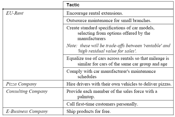 - e.g. the Tactic "Encourage rental extensions" is governed by the Business Policy "Allow extension of rentals by phone."