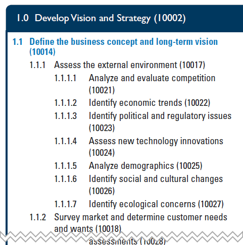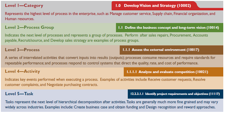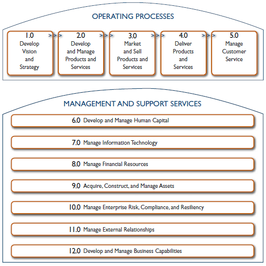 - The PCF organizes operating and management process into 12 enterprise level categories, including process groups and over 1000 processes and associated activities