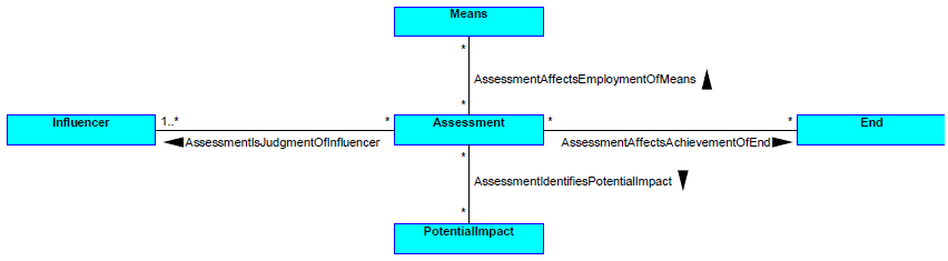 - An Assessment expresses a logical connection (i.e., fact type) between Influencers and the Ends and/or Means of the business plans