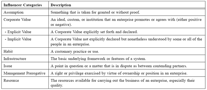 BMM categorizes influencers for analysis of the kinds of changes and resulting assessments and decisions