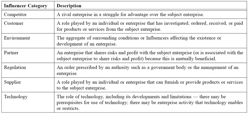 - The Influencers specifically of concern to business plans are those that can impact the enterprise in its employment of Means or achievement of its Ends. This impact has influence that is judged in Assessments.
